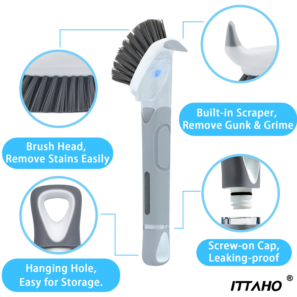 ITTAHO Dish Brush with Soap Dispenser & 3 Pack Dishwashing Sponge Refills, Grey