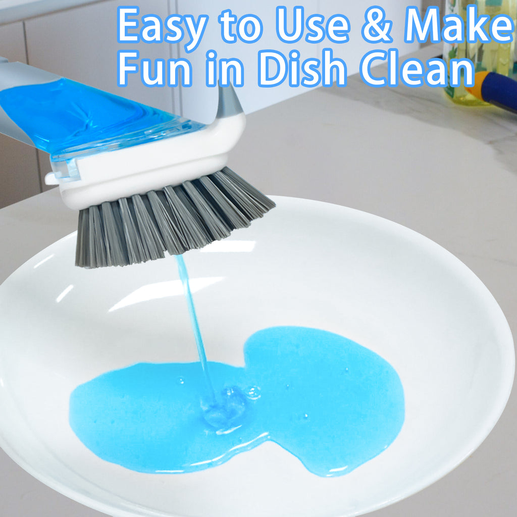 • STURDY & FUNCTIONAL CONSTRUCTION: A welcome improvement, it is a dish soap dispenser for cleaning. This sturdy kitchen dish brush with handle is made of PBT bristles, which prevent the build-up odors. Besides, the built-in scraper edge removes stubborn stains and stuck-on food efficiently. What's more, hanging hole is easy to sieve and keep in space.