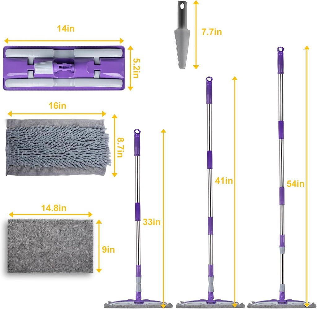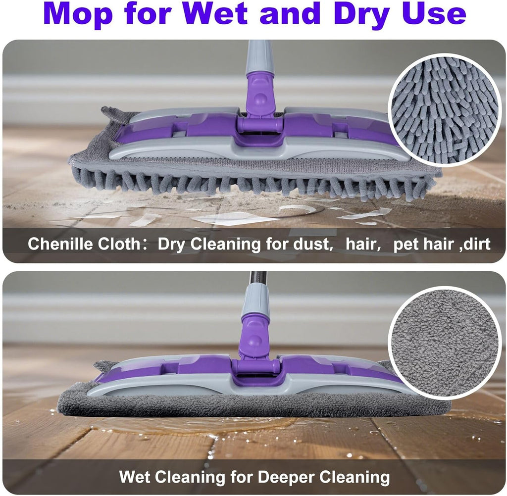 【Chenille Pads and Microfiber Pads】Our floor mop system is equipped with three microfiber pads with the size of 37*23.5cm/14.57*9.2 inch and one chenille cloth with the size of 36*21.5cm/14.17*8.46 inch, so you can switch between them freely. Compared with other mops, our microfiber mop pad has strong water absorption can deeply clean stubborn stains, and the chenille surface can effectively absorb fine dust and hair, which is very suitable for dry and wet cleaning. It can be washed by hand after use and can be reused